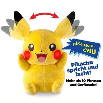 Hol dir diesen ganz besonderen Pikachu (ca. 27cm) nach Hause – denn er spricht und lacht. Der Kuschel Pikachu Pokemon benötigt 2x AA Batterien welche nicht im Lieferumfang enthalten sind.